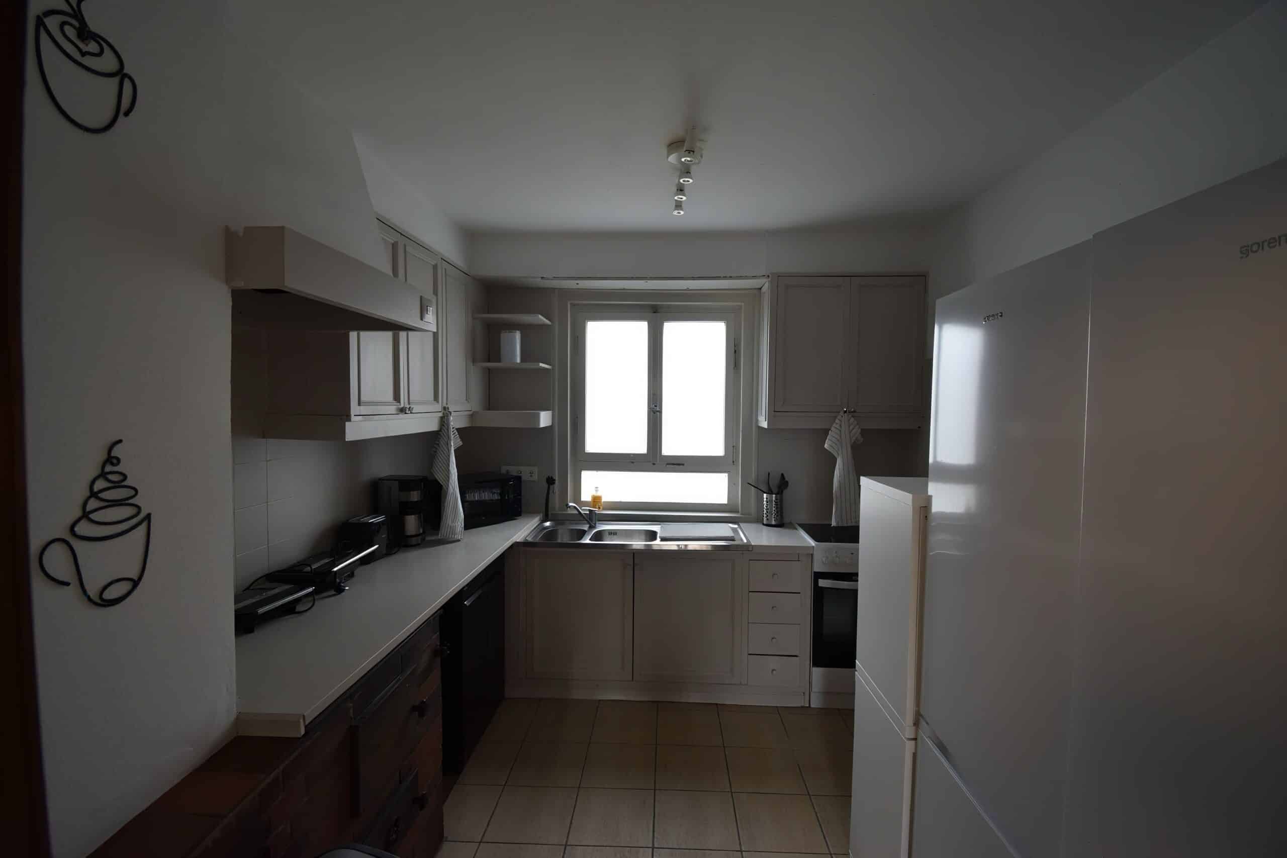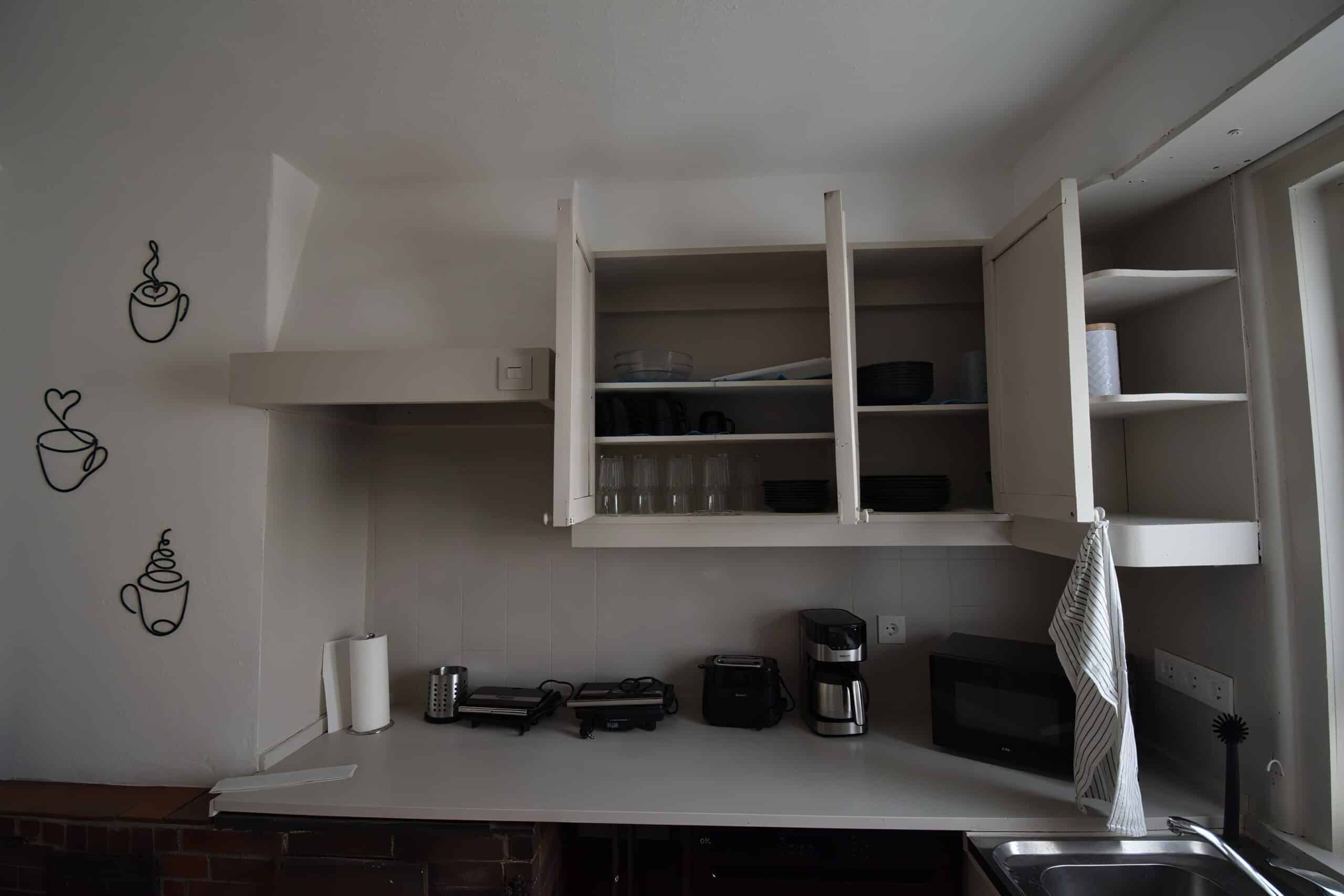 Herd, Kühlschrank, Mikrowelle, Kaffeemaschine, Toaster, Geschirrspüler, Geschirr, Töpfe.